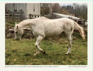 The following story about a horse named Jack was recently shared by Rosemary Farm Sanctuary, a large rescue organization located in upstate New York. https://www.rosemaryfarm.org/ [Photo credit to Honey Pie Productions.] The unnamed writer shared that Jack “lost his herd” when they were turned out for the night. Jack got distracted, and the other horses were out of sight in the huge, hilly sanctuary before he realized that he was alone. Jack’s history before his rescue is lost, but at some earlier point he had throat surgery that cost him his ability to neigh. Horses whinny or neigh as part of their communication, and it’s a critical tool for locating other horses in a herd. Without his neigh, Jack had no way to find his friends.